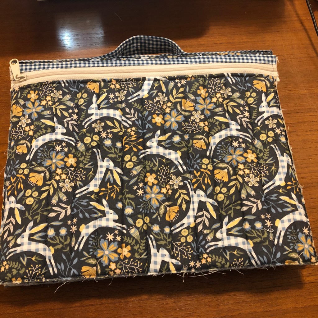 This past Friday I took the first of a two part class on the Running with Scissors Tool Case pattern. The pattern is from By Annie. During the class I was able to quilt my fabrics, cut all the pocket pieces and assemble all the pockets. Saturday night I was still jazzed from the class so I decided finish what I could on the tool case before next week’s class. I added all the pockets to the bag, added the handle and handle stabilizer. So I’m almost done with the first one. It still needs the corners rounded, the zipper added and the bias binding applied. The first one is for my mom and I started on a second one for myself. I don’t have zippers and mesh for my tool case so I’ll get as far as I can on that one before I have to go to the quilt shop to get those.