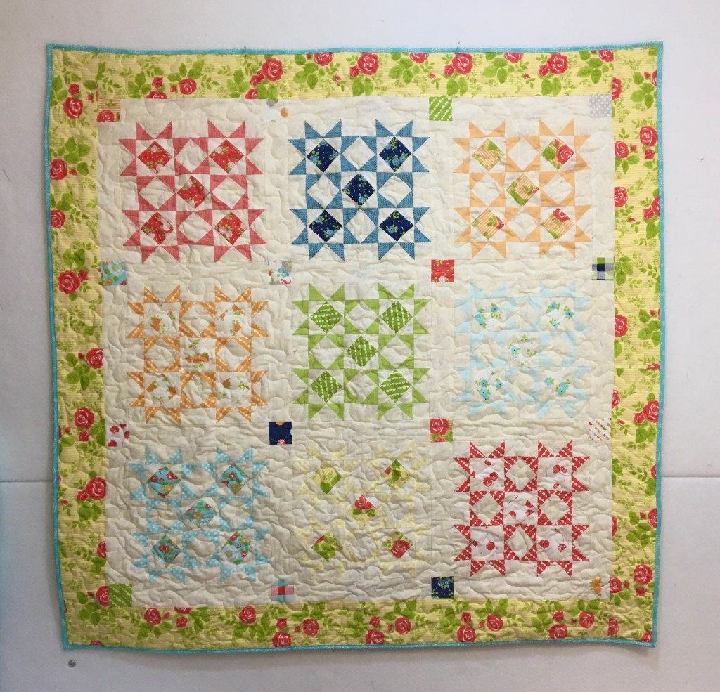 My mom and I also finished this layer cake quilt. It had already been quilted and it needed the binding put on so she went ahead a did that while I was there. I took it to guild meeting to do show and share and then donated it to the guild for a local charity.
