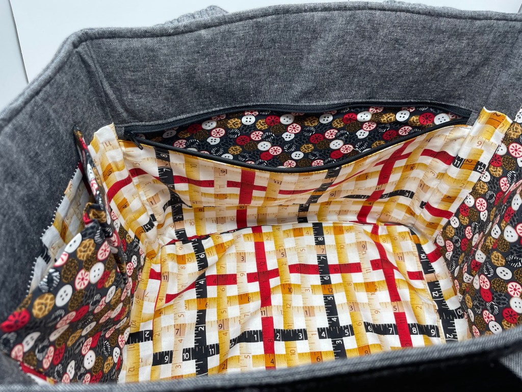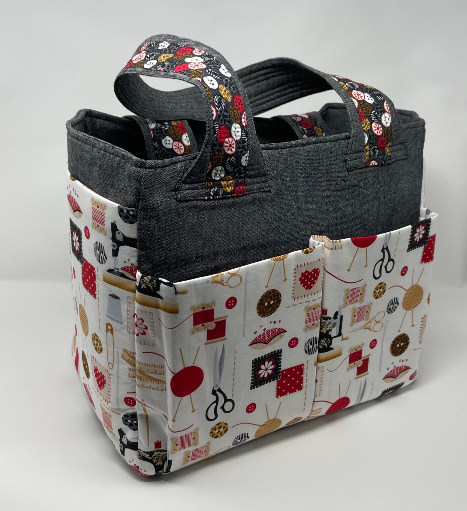 The last couple days I have been working on an Awesome Sewing and Travel Tote. It’s a fun tote pattern and I chose to make this one for a friend as a Christmas gift. I will say, it’s not for the faint of heart. Although not complicated, there are a lot of steps and turning out a bag with a vinyl bottom with stiff stabilizer is a workout for your upper body. The reward is a pretty cool and sturdy tote bag.