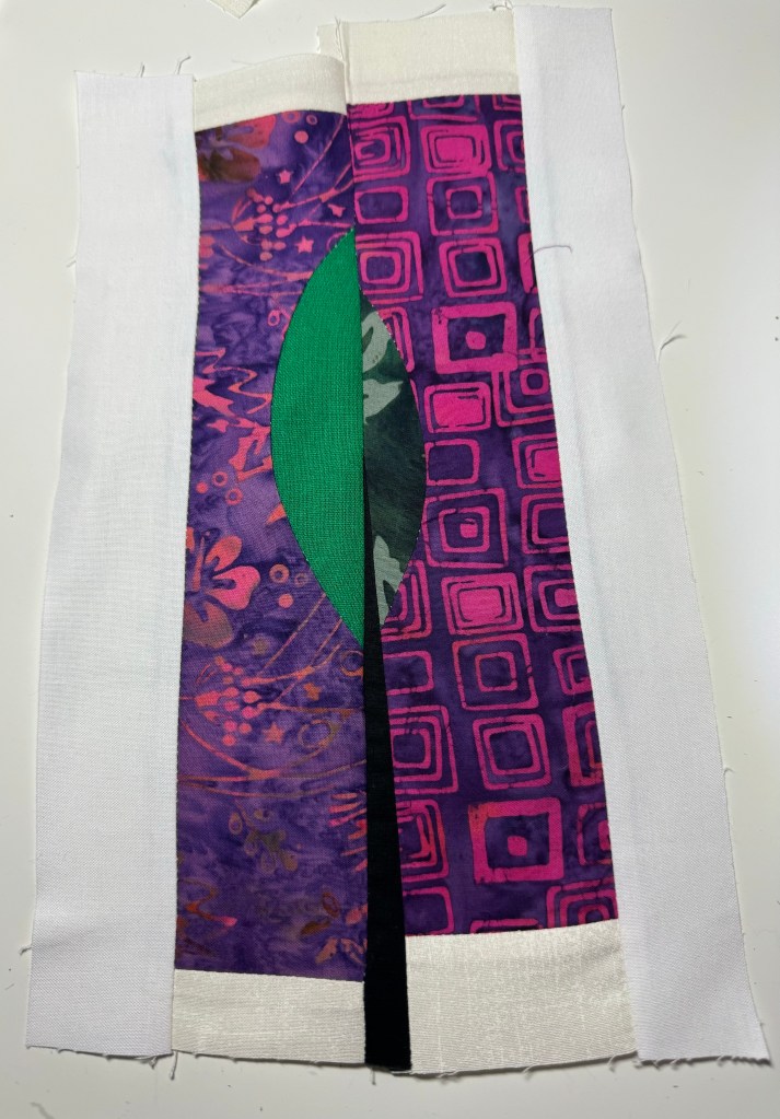 I don’t usually use batiks in my sewing and quilting so I don’t have a lot to experiment with. I pulled several large scraps from my scrap box that were batiks but could only find three pieces that were large enough. I grabbed a fourth solid to round out my testers. I tried the technique of stacking the blocks, cutting shapes, and shuffling the pieces to create different blocks.