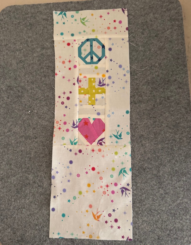 The other project I kind of distracted myself with is to start on some banners. I really love Happy Sew Lucky’s patterns and the graphic elements and bold colors used. I decided to make the Peace + Love banners for my mom, sister, and myself. The pattern comes in three sizes so I am making all three sizes. I did get the smallest banner together and need to lightly quilt it and turn it into a banner. The other two are awaiting me to finish the peace sign block so I can put them together. I used Tula Pink fabric for the background and Ruby Star Society Starry prints for the elements.